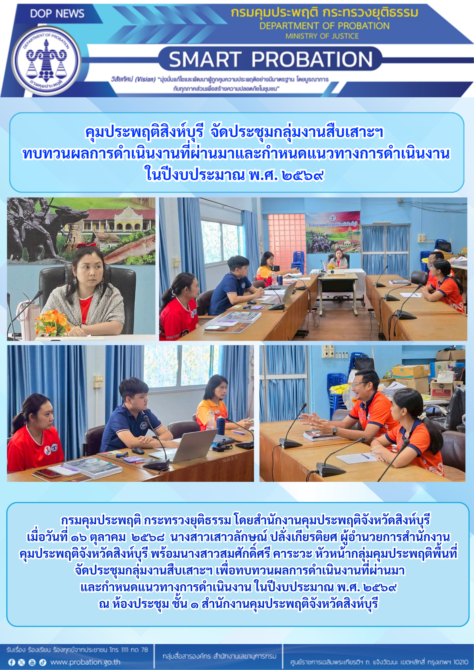 เมื่อวันที่ ๑๖ ตุลาคม ๒๕๖๘ นางสาวเสาวลักษณ์ ปลั่งเกียรติยศ ผู้อำนวยการสำนักงานคุมประพฤติจังหวัดสิงห์บุรี พร้อมนางสาวสมศักดิ์ศรี คาระวะ หัวหน้ากลุ่มคุมประพฤติพื้นที่ จัดประชุมกลุ่มงานสืบเสาะฯ เพื่อทบทวนผลการดำเนินงานที่ผ่านมาและกำหนดแนวทางการดำเนินงาน ในปีงบประมาณ พ.ศ. ๒๕๖๙ ณ ห้องประชุม ชั้น ๑ สำนักงานคุมประพฤติจังหวัดสิงห์บุรี