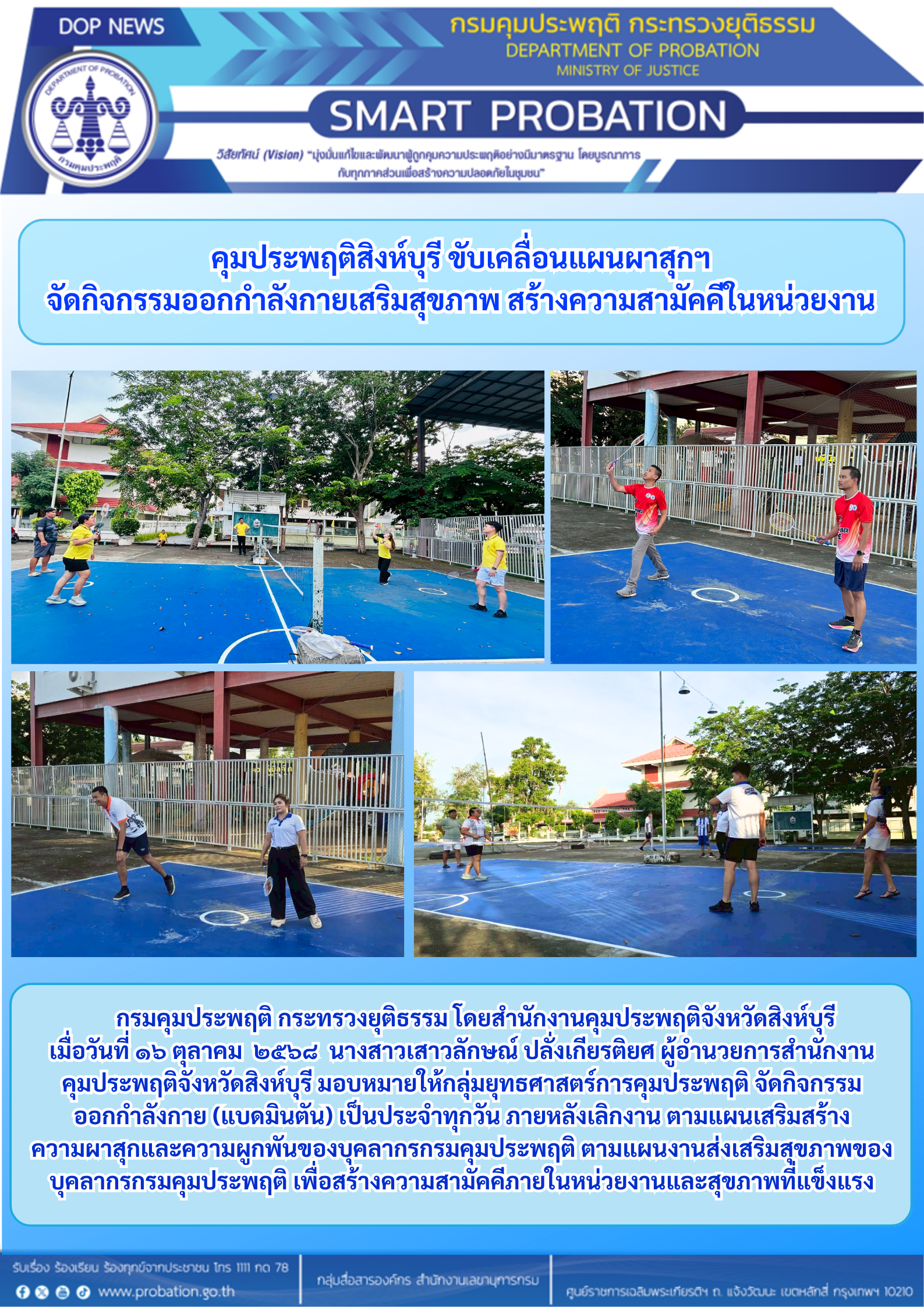 เมื่อวันที่ ๑๖ ตุลาคม ๒๕๖๘ นางสาวเสาวลักษณ์ ปลั่งเกียรติยศ ผู้อำนวยการสำนักงานคุมประพฤติจังหวัดสิงห์บุรี มอบหมายให้กลุ่มยุทธศาสตร์การคุมประพฤติ จัดกิจกรรม ออกกำลังกาย (แบดมินตัน) เป็นประจำทุกวัน ภายหลังเลิกงาน ตามแผนเสริมสร้างความผาสุกและความผูกพันของบุคลากรกรมคุมประพฤติ ตามแผนงานส่งเสริมสุขภาพของบุคลากรกรมคุมประพฤติ เพื่อสร้างความสามัคคีภายในหน่วยงานและสุขภาพที่แข็งแรง