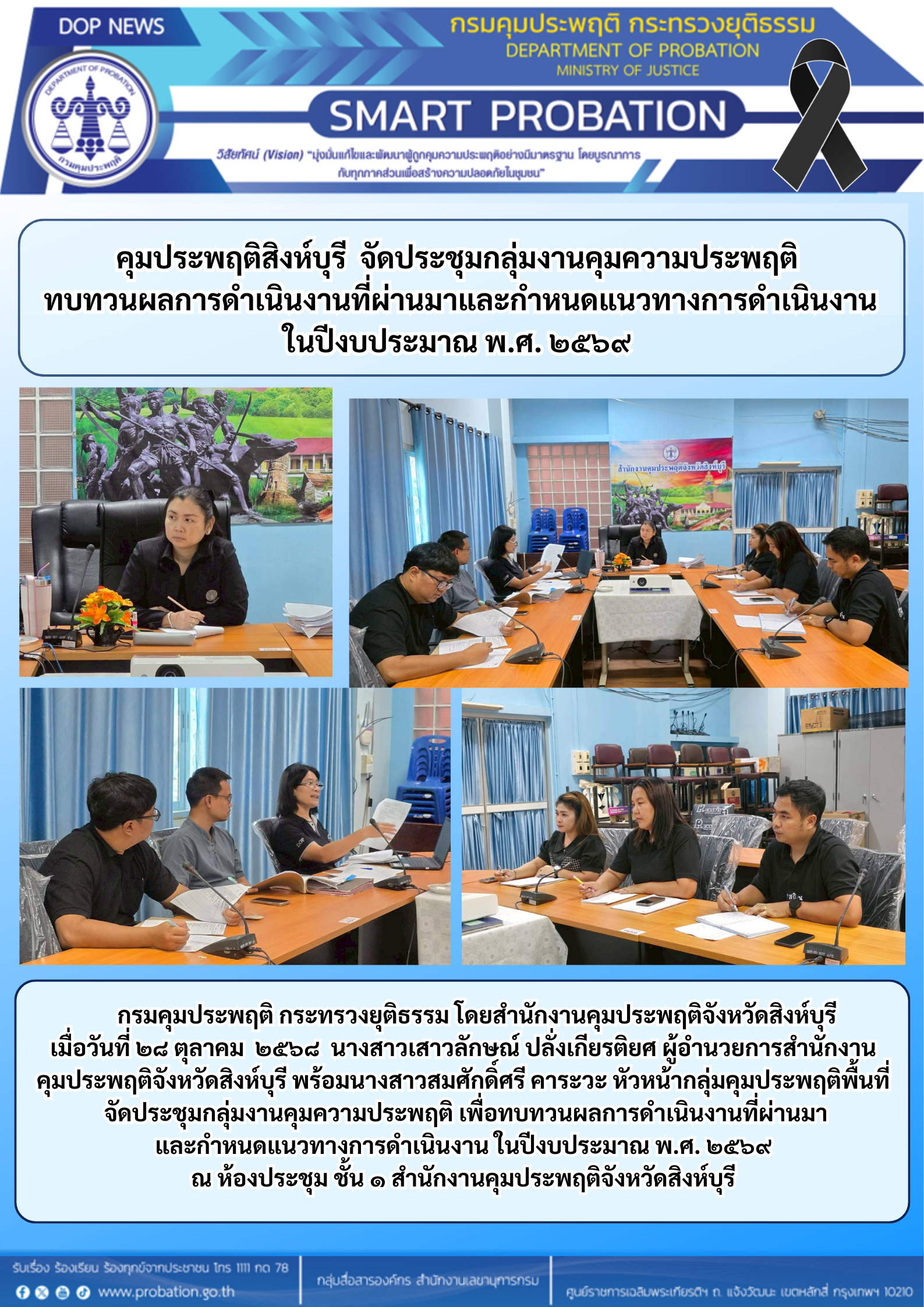 เมื่อวันที่ ๒๘ ตุลาคม ๒๕๖๘ นางสาวเสาวลักษณ์ ปลั่งเกียรติยศ ผู้อำนวยการสำนักงานคุมประพฤติจังหวัดสิงห์บุรี พร้อมนางสาวสมศักดิ์ศรี คาระวะ หัวหน้ากลุ่มคุมประพฤติพื้นที่ จัดประชุมกลุ่มงานคุมความประพฤติ เพื่อทบทวนผลการดำเนินงานที่ผ่านมาและกำหนดแนวทางการดำเนินงาน ในปีงบประมาณ พ.ศ. ๒๕๖๙ ณ ห้องประชุม ชั้น ๑ สำนักงานคุมประพฤติจังหวัดสิงห์บุรี